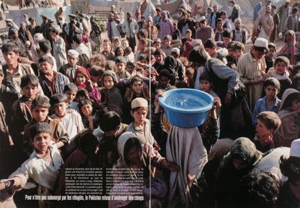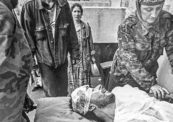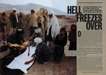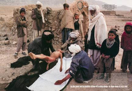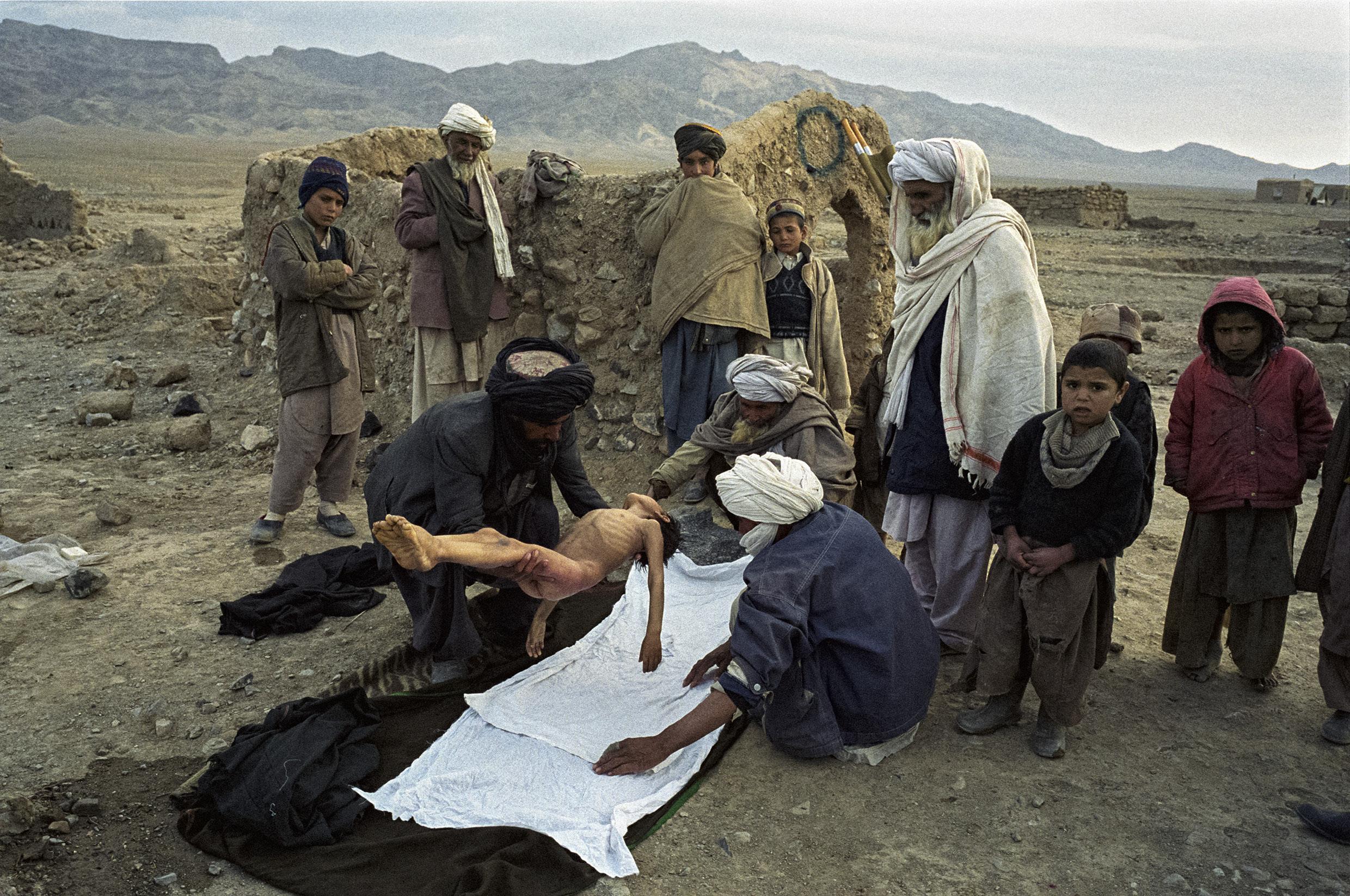 Preparations for the funeral of an 8-year-old child who died of cold in Herat Marsak refugee camp. His two uncles prepare the body before bringing him to the camp cemetery under the eyes of a few of his family members. 30,000 internally displaced people live in miserable conditions in a camp a few kilometers away from Herat, Western Afghanistan. Because of the draught and the war raging on several fronts in Afghanistan, one million people face a humanitarian disaster all over the country. Near Herat, Western Afghanistan, February 15, 2001.