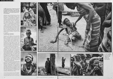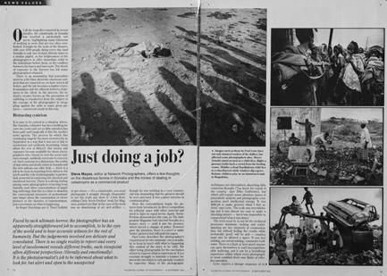 has been paid until magically it hits the media’s news agenda. The process by which this continuing tragedy becomes newsworthy in September in a way that it was not in July is mysterious and endlessly frustrating (what about the rest of Africa?). But money and exposure become available for those photographers who choose to visit the scene and, sure enough, suddenly everyone is concerned. Such cynicism is a distraction: the reality of starvation and death exists in Somalia and the rich nations can offer help — there is a job to be done in reporting from Africa to the north and the role of photography is particularly powerful in conveying the physical and emotional horrors. There is a strong feeling among some photographers returning from Somalia (and other concentrations of appalling suffering) that this is a time to abandon the conventional measures of professionalism: forget about the construction of clever pictures or the theories of representation, just concentrate on what is happening.