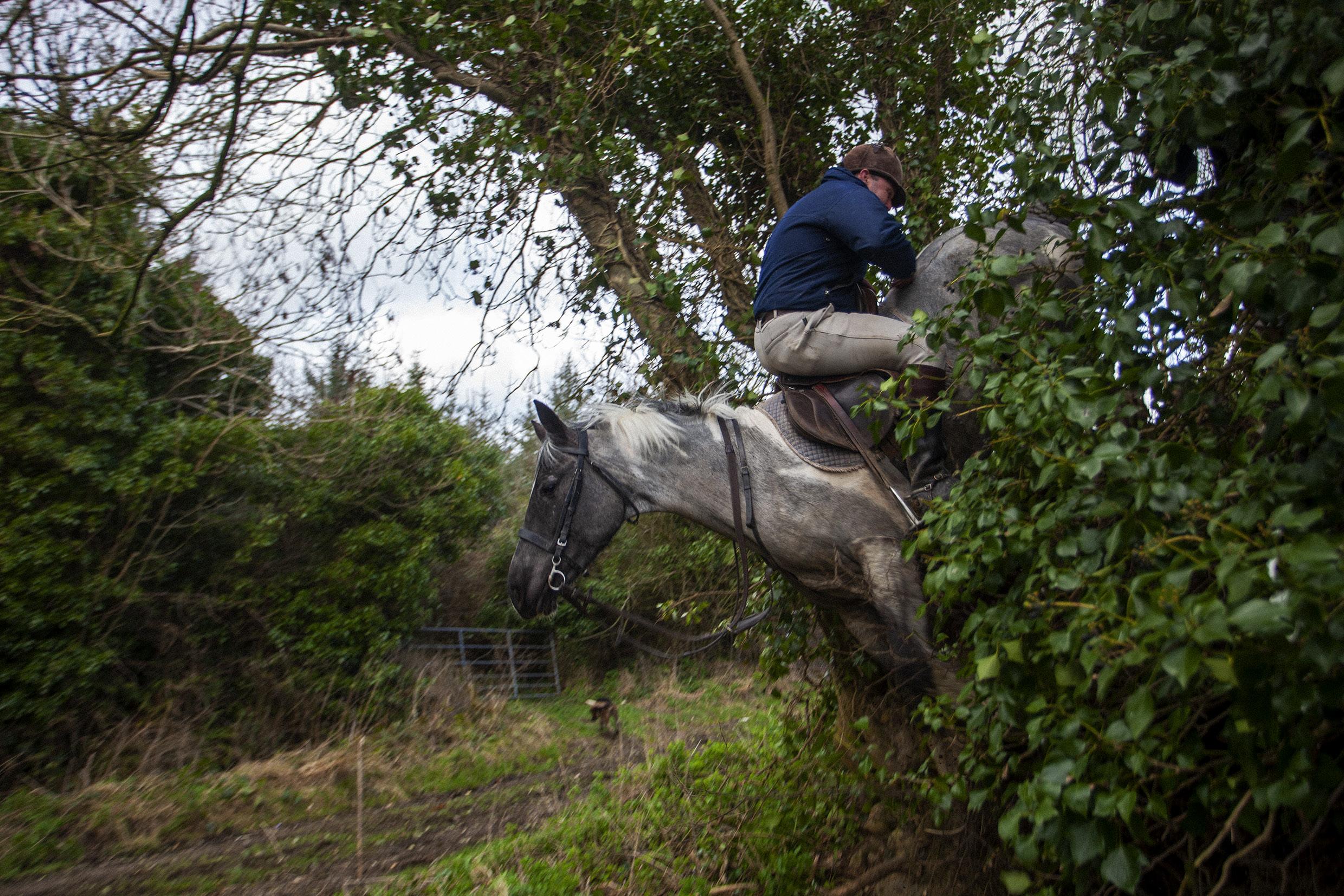 A man displays his horsemanship by riding backwards over a steep hedge during an afternoon with the Killinick Harriers Hunt Club. From the book The Republic (Allen Lane, 2016), Seamus Murphy’s personal and immediate look at his homeland on the eve of the 100th anniversary of its revolutionary Easter Rising, which paved the way for independence for the south of the island, the Republic of Ireland. Grange, Killinick, County Wexford, Republic of Ireland, March 10, 2011.