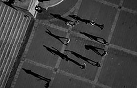 So there’s a lot of history at work here, especially if we go along with T.S. Eliot’s famous gloss on a line of Emerson’s: that history is the lengthened shadow of a man. People appear as counters on the patterned squares of an urban board: pawns in a geopolitical game. Lest we get overly anxious, however, there’s nothing really sinister going on. This, after all, is a photographer’s entirely non-lethal project. We have nothing to fear. The design is aesthetic (albeit ideologically loaded) rather than strategic, and the results are summer-sky beautiful. Especially
