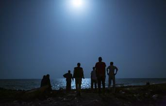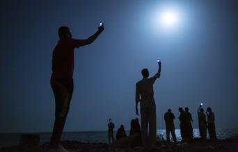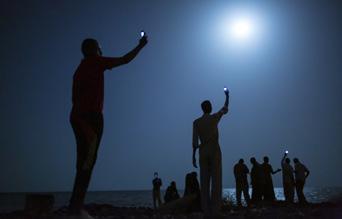 The more you look at these jet-black shapes, the deeper the temporal perspective becomes. The stretched silhouettes acquire not just the primal quality of Giacometti’s etiolated sculptures. They start to loom like figures painted on a cave wall: humans vulnerable to the threat of beasts and forces they hope to keep at bay. In the caves, that threat is always abundantly depicted. Here it is nowhere to be seen. It is the seeing.