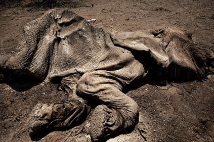 The corpse of a giraffe lies in the dry bed of a river in a desert area north of the town of Waijir in Northeast Kenya, near the border with Somalia, October 2009.