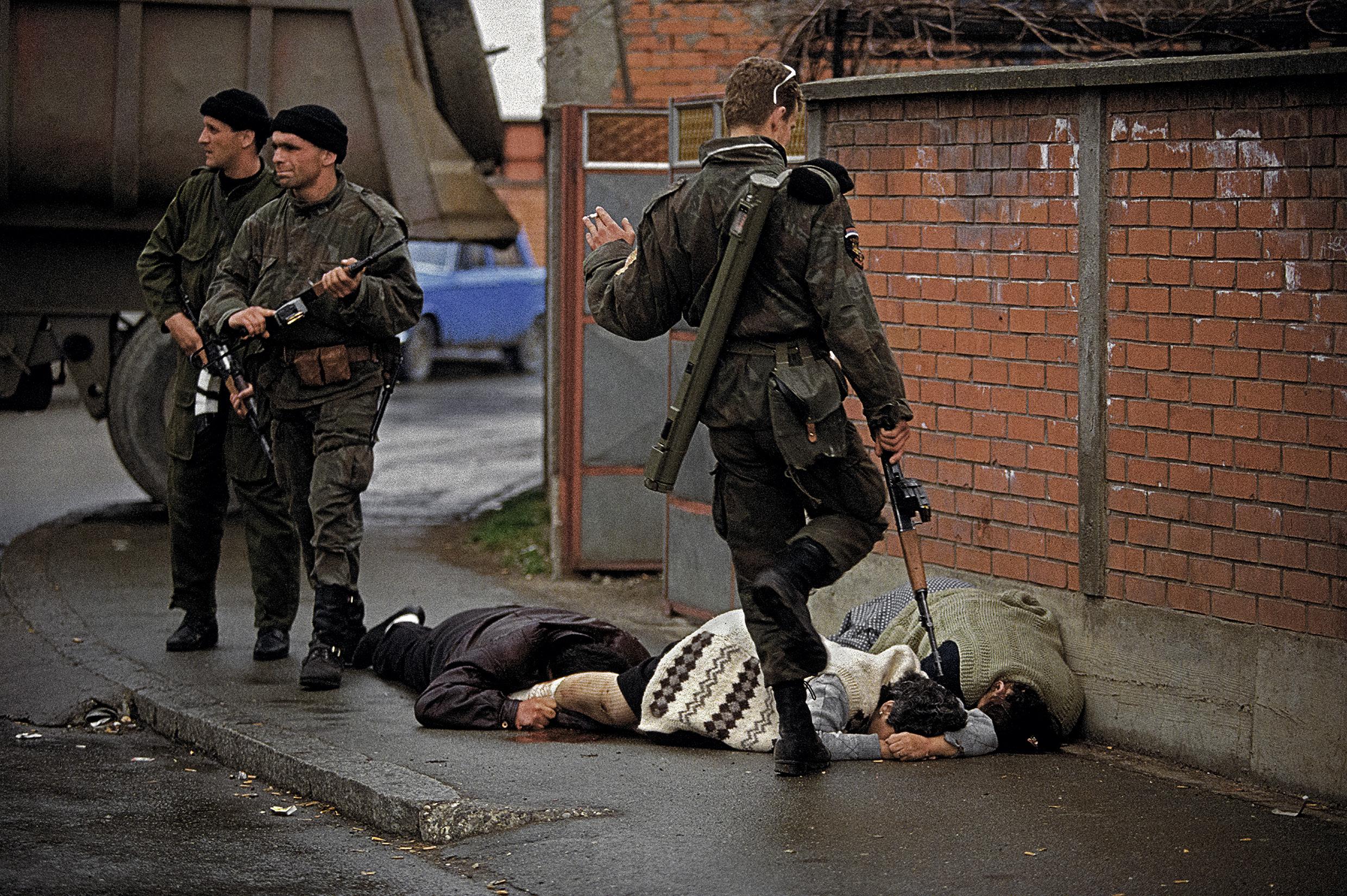 Members of Arkan’s Serbian paramilitary group, the Tigers, with executed unarmed Muslim civilians Abduraham (L), Hamijeta Pajaziti (R), and Ajša (Tifa) Šabanović (C) during the first battle of the Bosnian war. Bijeljina, Bosnia, April 2, 1992.