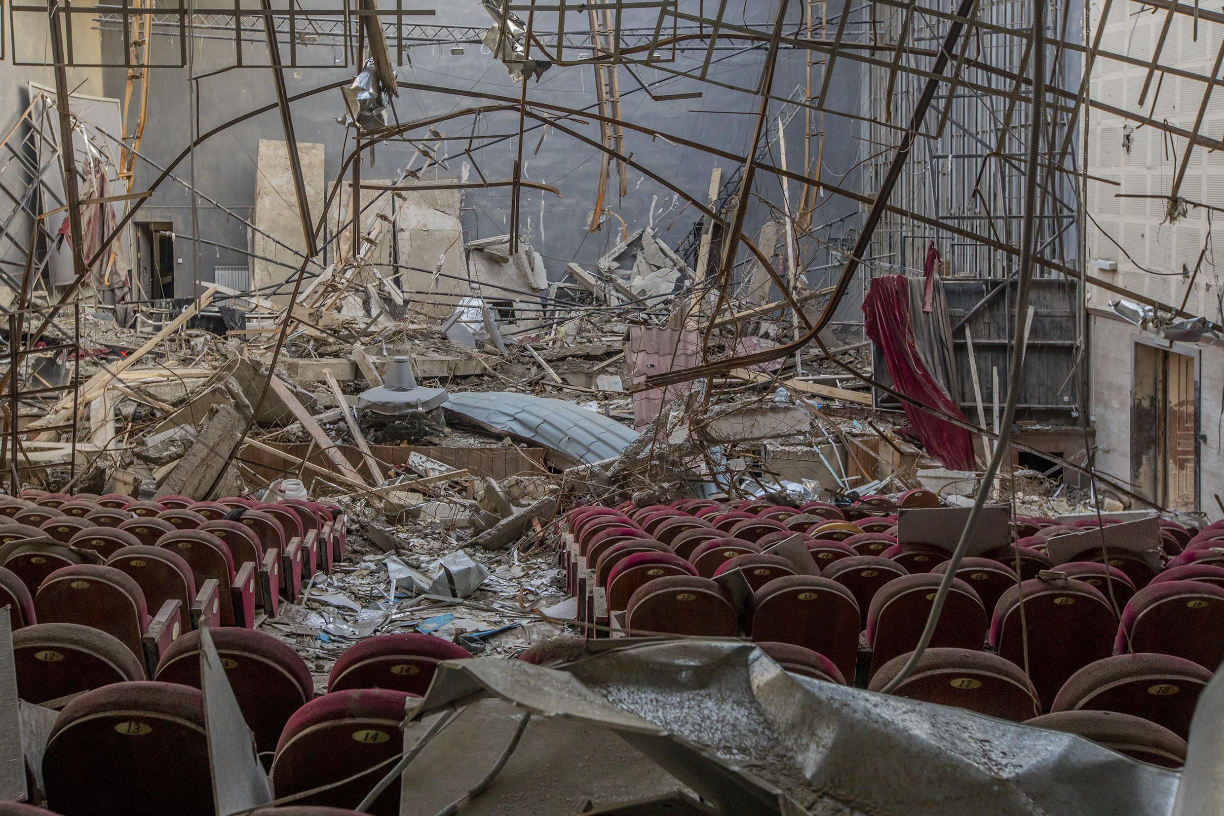 The ruined auditorium of the House of Culture in Shushi. It was shelled in the first days of October 2020, during the 44-Day War in Nagorno-Karabakh. Shushi, Nagorno-Karabakh, October 16, 2020.