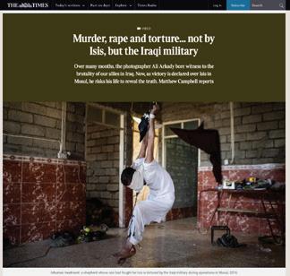 Over many months, the photographer Ali Arkady bore witness to the brutality of our allies in Iraq. Now, as victory is declared over Isis in Mosul, he risks his life to reveal the truth Matthew Campbell reports INHUMAN TREATMENT shepherd whose son had fought for Isis is tortured by the Iraqi military during operations in Mosul, 2016 The Sunday Times Magazine 15 The Sunday Times Magazine One man hangs from the ceiling, arms stretched at an impossible angle behind him, moaning in agony. Another kneels in the sand, then leaps up, trying to flee, begging for his life. Two men run after him, shooting. He falls, his body twitching at each bullet. The video looks like the handiwork of Isis, which relishes posting horrors online. What makes these atrocities even more shocking that they were carried out not by the bearded extremists of the caliphate but by the Iraqi government’s Americantrained security forces. Ali Arkady, prizewinning Kurdish photographer, has risked his life by publishing what amounts to evidence of war crimes by our allies in the fight against terror. “It is important for the world to see what they are doing. want to stop them doing more of it,” says Arkady in an interview with The Sunday Times after fleeing Iraq with his wife and daughter. He in Europe but did not want us to say where: wanted man in his homeland, he has received death threats since smuggling his photos out of the country. A compact, diminutive figure with melancholic eyes and gentle smile, Arkady, 36, has lived his whole life in the shadow of war. One of his earliest memories is of dog eating body on street in Khanaqin, his home town in northeastern Iraq, during the dictator Saddam Hussein’s savage campaign against Kurds. But Iraq’s latest, bloody convulsions and the scenes Arkady chronicled as photographer have left greater mark on his soul. On two occasions, he was compelled to participate in beatings of prisoners, crossing the line from observer to unwilling accomplice — “a very, very bad thing”, he admits, that has left him consumed by guilt over how his sense of morality was drowned by the will to survive. He watched as prisoners he believes to have been innocent were cut with knives, suffocated with plastic bags or hanged by their arms from the ceiling as interrogators screamed at them to confess their allegiance to Isis. “I will never get the images out of my mind,” says Arkady, speaking at the home of friends. “Each day, the camera felt heavier and heavier in my hand. By the end, could barely hold it. had to take my heart out of
