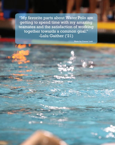 “My favorite parts about Water Polo are getting to spend time with my amazing teamates and the satisfaction of working together towards a common goal.” -Lulu Gaither (‘21) Photo by Conner Lusk