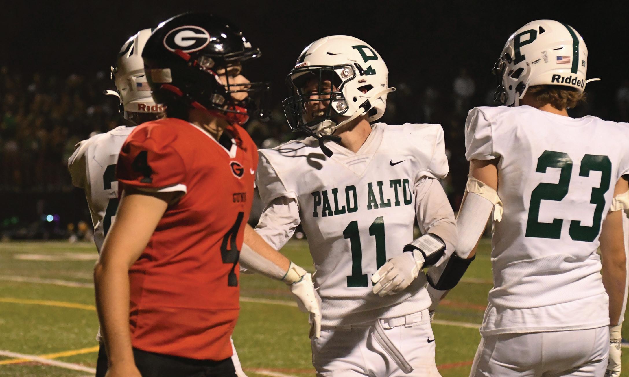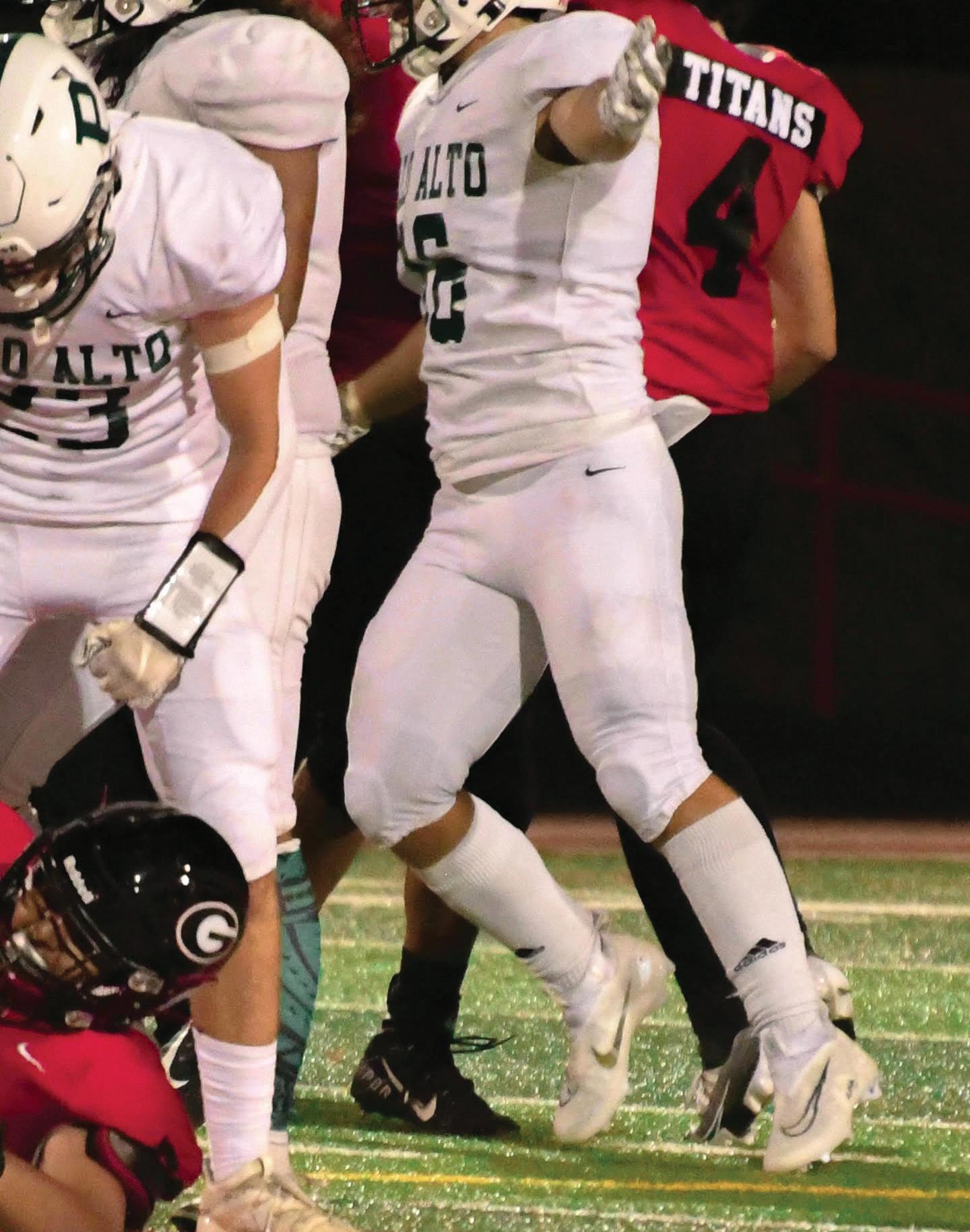 Paly football played crosstown rivals Gunn for the first time in 12 years, winning 41-0. “The game was amazing,” Va’inga Mahe (‘23) said. “We were firing on both sides of the ball.” Pictured: Luke Young (‘23) flexes after blocking a Gunn player.