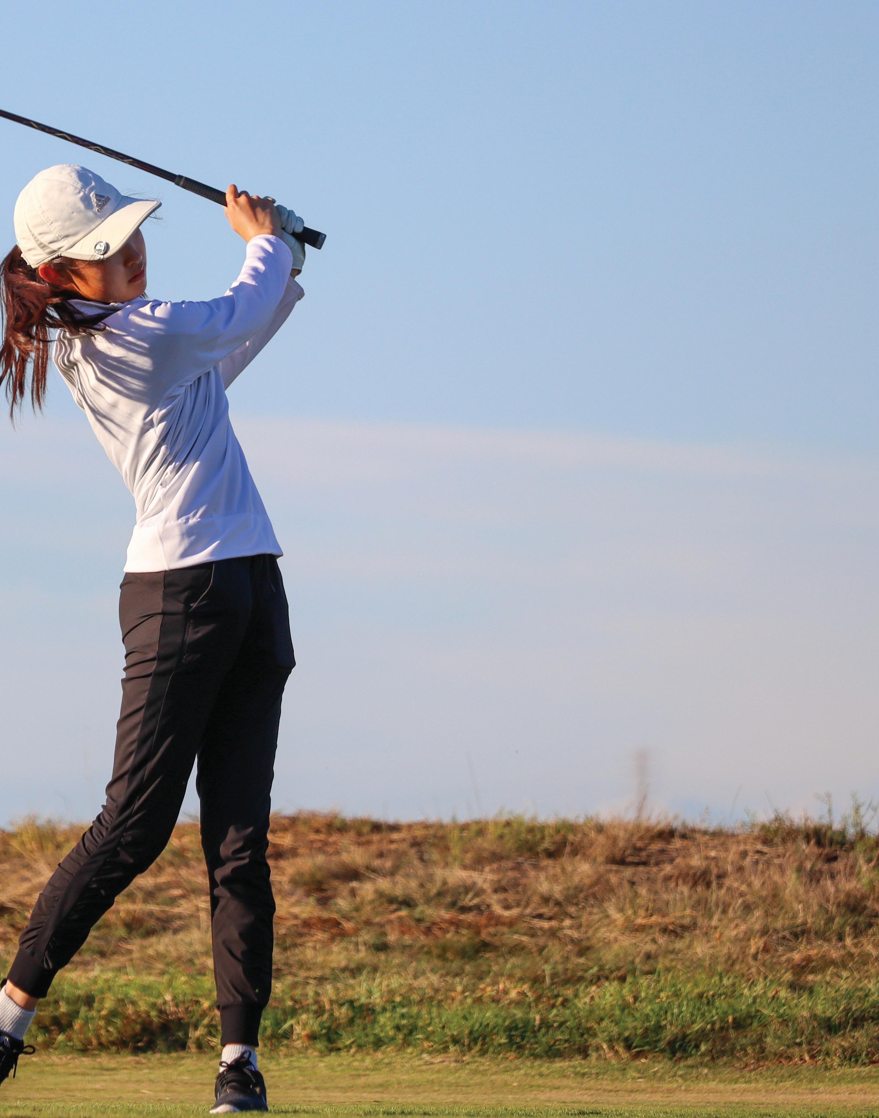 Paly girls golf defeated Monta Vista for their first league win of the season with a score of 208-239. “It felt good [to defeat Monta Vista],“ Allyson Lee (‘23) said. Pictured: Angelina Chen (‘24) watches her shot after swinging at the Bayland’s 16th hole.