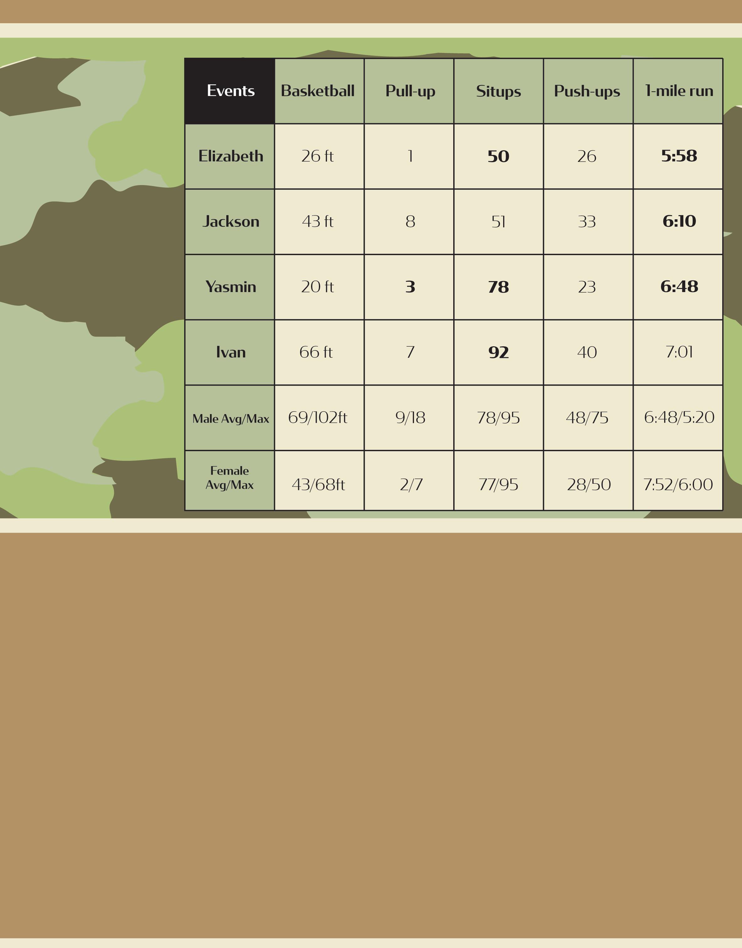The Viking Staff took their shot at West Point Military Academy fitness testing, preforming push-ups, sit-ups, pull-ups, a basketball throw then running a mile. Check out their results and qualifications on page 44.