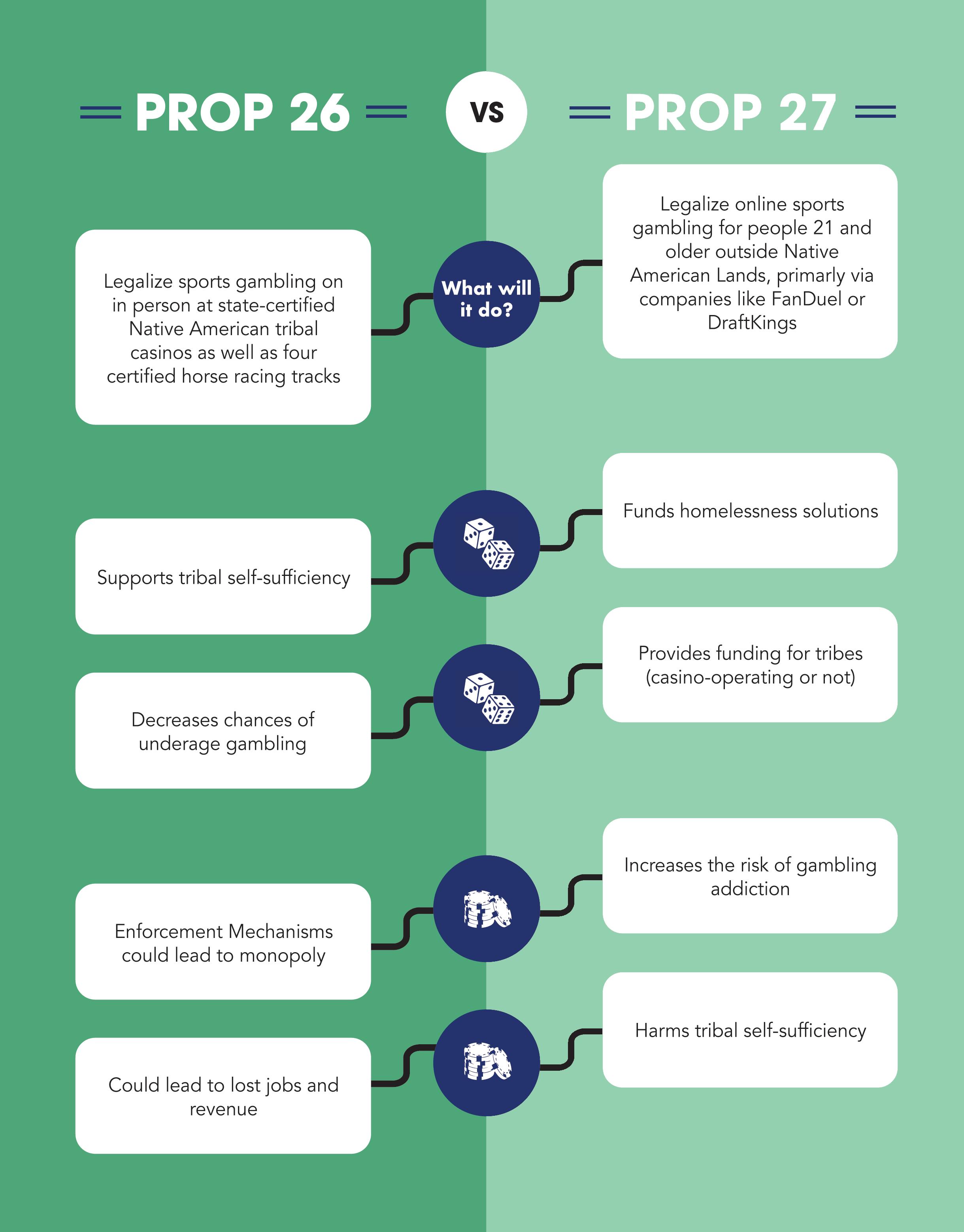 This November, California voters will decide whether to legalize sports gambling, and choose whether it will be online, in person, or both. There are a myriad of decisions to consider when voters are making their choice this November. To legalize gambling will inherently increase addiction, as Delaney remarks. Both measures claim to support tribal sovereignty, and different tribes (and different numbers of tribes) support different measures.