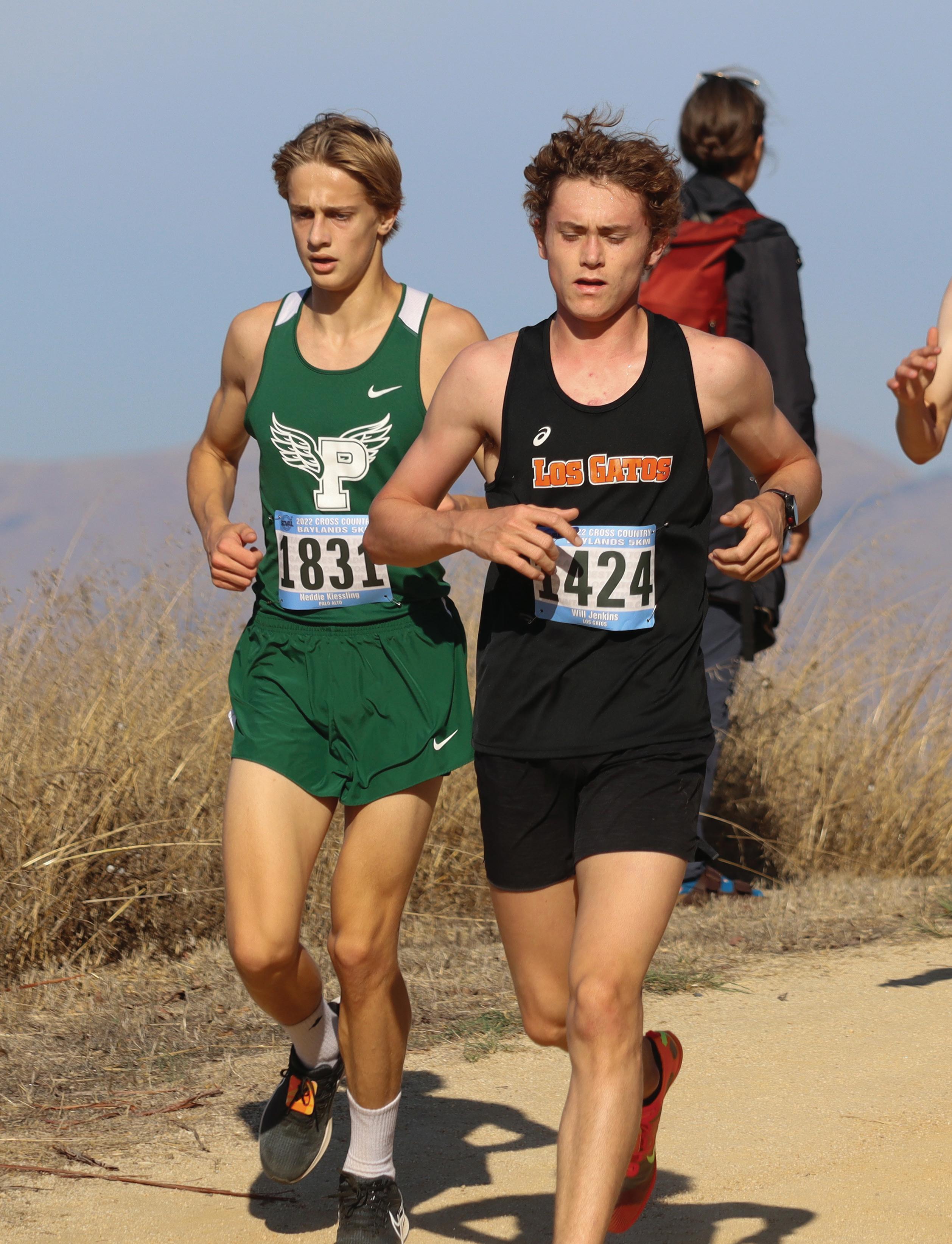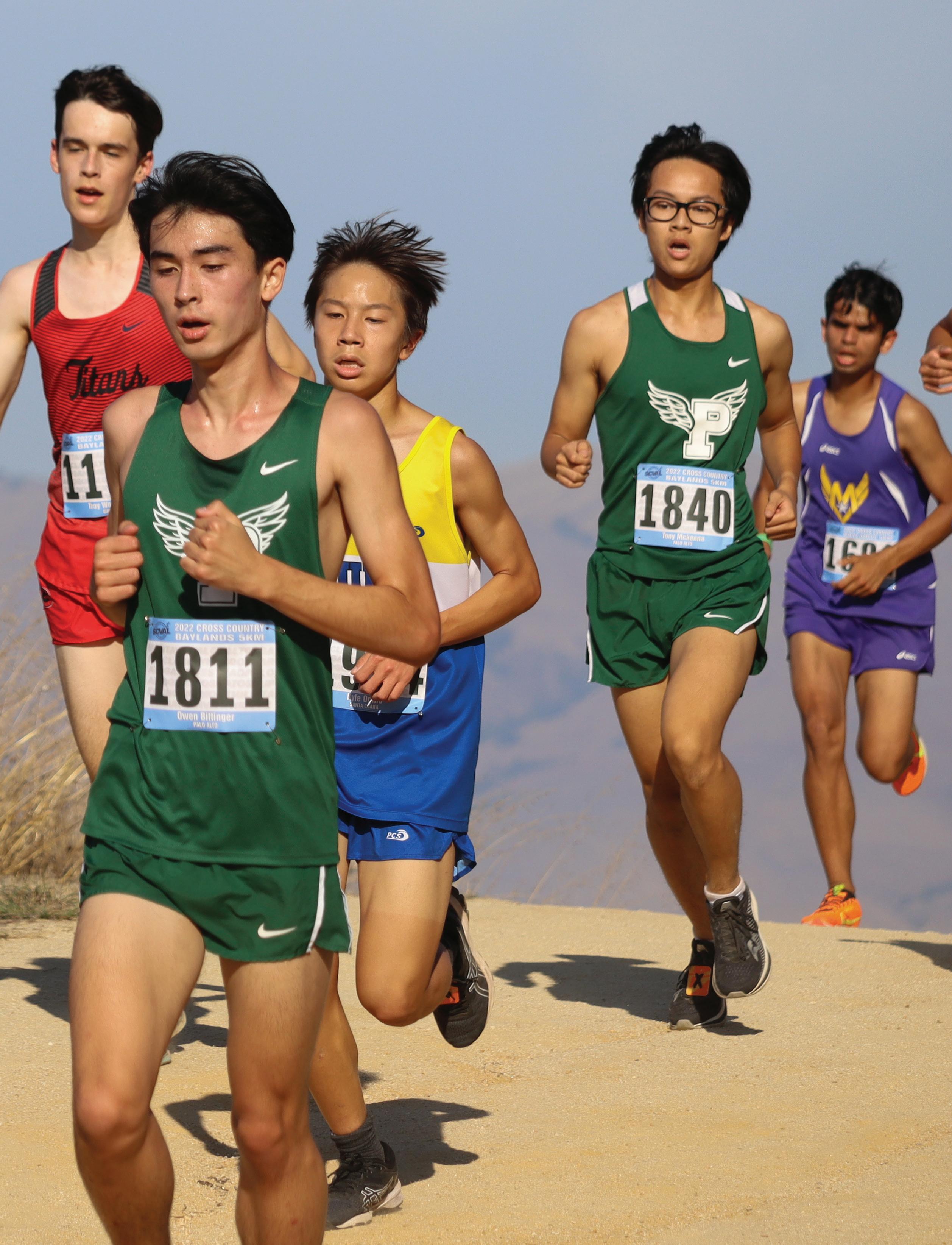 Paly boys cross country finished first at the third SCVAL race at Baylands Park in Sunnyvale. “It felt very good to work as a team and all of my teammates were very supportive throughout the meet,” junior Tony Mckenna said. Pictured: Neddie Kiessling (‘24), Owen Bittinger (‘23), and Mckenna during the last stretch of the race.