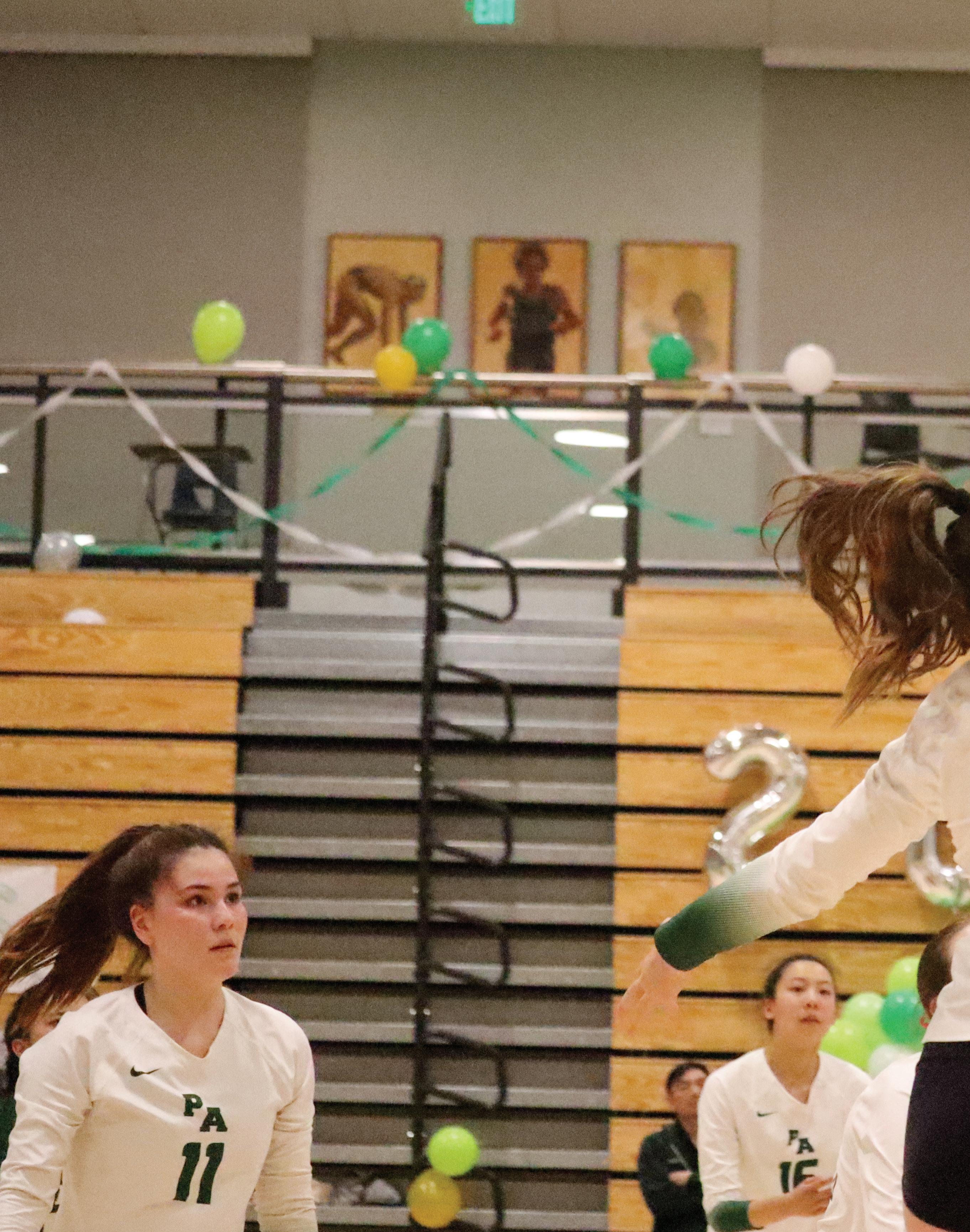 Paly girls volleyball beat Monta Vista 3-2, completing the reverse sweep on senior night. “I am incredibly proud to be able to pull off that win,” senior Evie Kramer said. Pictured: Kramer fools the opposition using a feint to score.