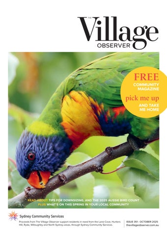 The Village Observer is published monthly (except January) by Sydney Community Services (trading as Lane Cove Community Aid Foundation) • Distribution occurs at the beginning of the month • Readers are invited to submit articles for consideration. • Articles and items for community events should be emailed to the Editor with any accompanying images by the 15th of each month, for inclusion in the next month’s issue. • Advertising enquiries should be directed to advertising@thevillageobserver. com.au • If mailing material and you would like it returned, please include a stamped, self-addressed envelope. All care, but no responsibility will be taken for this material. © Copyright 2021. Original advertisements and editorial in this publication are copyright and remain the exclusive property of The Village Observer. No part of this publication may be reproduced and/ or transmitted in any form or by any means without the written consent of the Publisher. DISCLAIMER: The content of editorial and advertisements in The Village Observer has been provided by a number of independent sources. Any opinions expressed are not necessarily those of the Editor and Publisher of The Village Observer, and no responsibility is taken for the accuracy of the information, or any factual errors contained within any items printed. Readers should make their own enquiries directly to any organisations or businesses prior to making any plans or taking any action.