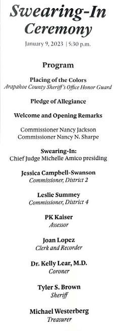 The event was a well-organized installation of incumbents and new office holders. Seven newly elected officials will resume the duties of operating budgets, law enforcement, taxation, and appraisal duties in the various offices. All seven elected officials are members of the Arapahoe County Democrat Party. (See photos and narrative on pages 6 and 7 in this