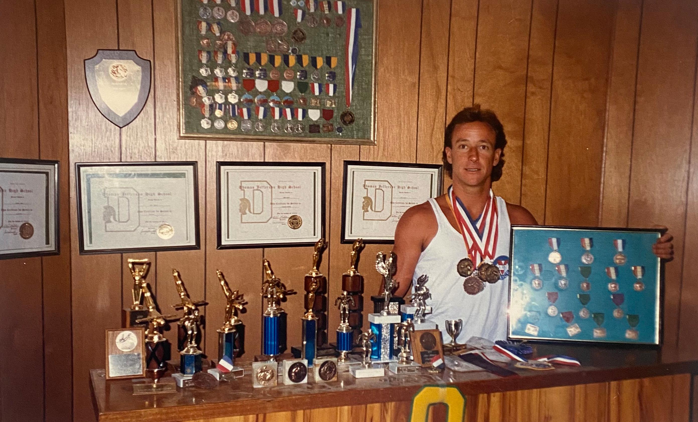 Jeff, the tremendous athlete, with his medals and trophies (He went to University of Oregon on a full ride, graduated from Metropolitan Sate College – now Metropolitan State University of Denver and was its first inductee into its first Sports Hall of Fame)