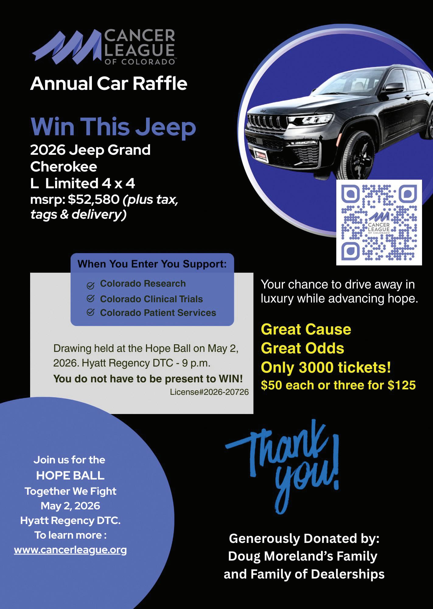 Win a 2026 Jeep Grand Cherokee L Limited 4x4. Drawing at the Hope Ball MAY 2, 2026, HyattRegency DTC, 9 p.m. You do not have to be present to win. Donated by Doug Moreland’s Family & Family of Dealerships. Only 3000 tickets sold. Info: www.cancerleague.org