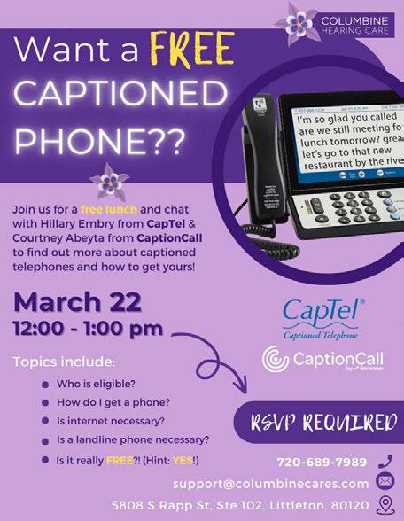 A: Yes! Captioned phones are a wonderful technological solution for people with hearing difficulties, and they are free for people who need them! Captioned phones have a large screen that shows the written version of what the person on the other end of the line is saying. And the best part is that captioned phones are funded by the government, so they are FREE to you! The captioned phone companies require a type of “prescription” from your hearing care provider that proves that you have hearing loss. Once that is submitted by you or your hearing care provider, they will come to your home, install the phone, and show you how to use it - all at no cost to you! This is such a wonderful service and we are lucky in Colorado to have 3 different companies that offer captioned phones! To learn more about this fantastic option, I hope your readers will join us for our March 22nd Lunch and Learn event (12pm-1pm at Columbine Hearing Care). Representatives from two of the Colorado captioned phone providers will have demonstrations of their phones and answer all questions about this valuable service. And Columbine Hearing Care will be providing free lunch to all attendees! However, space is limited, so please be sure to RSVP by calling our office at 720-689-7989.
