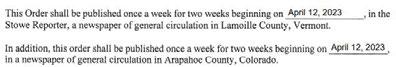 GUARANTEED TAX DEFERRED MULTI-YEAR ANNUITY UP TO 6% Rates change weekly, One - Five Year Terms CALL LAVELLE KNIGHT Call 303-794-4084 LKnight@frontrangefinancial.com 2305 E. Arapahoe Rd. #235, Centennial CO 80122 Colorado Statewide Network To place a 25-word COSCAN Network ad in 91 Colorado newspapers for only $300, contact The Villager Newspaper at 303-773-8313 PORTABLE OXYGEN DIRECTV DIRECTV, New 2-Year Price Guarantee. The Most live MLB Games this season, 200 +channels and over 45,000 on-demand titles. $84.99/mo for 24 months with CHOICE Package. Some restrictions apply. Call DIRECTV 1-888-725-0897 AMERIGLIDE Don't let the stairs limit your mobility! Discover the ideal solution for anyone who struggles on the stairs, is concerned about a fall or wants to regain access to their entire home. Call AmeriGlide today! 1-877-418-1883 Portable Oxygen Concentrator. May be Covered by Medicare! Reclaim independece and mobility with the compact design and long-lasting battery of Inogen One. Free Information Kit! Call: 844-823-0293 COLORADO STATEWIDE CLASSIFIED ADVERTISING NETWORK To place a 25-word COSCAN Network ad in 91 Colorado newspapers for only $300, contact your local newspaper or email Colorado Press Association Network at rtoledo@colopress.net LEGALS PAGE 24 | THE VILLAGER • February 23, 2023 KEYA POBANZ AND JOHN DOE, Respondents. Kiley Schaumleffel, Esq. #46107 Sarah Simchowitz, Esq. #44890 Assistant County Attorney 14980 East Alameda Drive Aurora, CO 80012 PH: 303.636.1308 Case No: 22JV433 Division: 22 NOTICE OF TERMINATION HEARING – JOHN DOE TO THE RESPONDENTS HEREIN: PLEASE TAKE NOTICE that a Termination of Legal Parental Rights Hearing in this action regarding JENEVIEVE POBANZ has been set. The termination hearing is currently set on May 26, 2023 at 8:30 A.M. in Division 22. The Termination of Legal Parental Rights Hearing will take place via Division 22 WebEx. The Arapahoe County District Court is located at 7325 South Potomac Street, Centennial, Colorado 80112. Due to COVID 19, the Arapahoe County District Court is holding hearings via Cisco WebEx Meetings to allow for audiovisual and/or audio participation. Participants may use any computer, tablet or smart phone equipped with a camera and microphone for audiovisual participation. Parties should use the following link: •https://judicial.webex.com/meet/ D18-ARAP-Div22 •Enter your name and email address (so we know who you are). You will then be in the virtual courtroom. •Select your audio setting. If the audio on your computer or tablet does not work, please use the alternate audio option of calling in to the number below. •If you do not have a device that will support a video connection, you may still participate by audio only by calling 720-650-7664. When prompted enter Access code: 927 2594 887 9073 then press #, # (no attendee ID is needed). YOU ARE FURTHER COMMANDED to appear before the Court at said time and place, either in person or by phone. If you elect to appear in person, you must be at the Courthouse a half hour before the hearing is scheduled to begin. IN THE EVENT YOU FAIL TO APPEAR FOR THE TERMINATION HEARING ON May 26, 2023, THE PETITIONER WILL REQUEST THAT THE COURT ENTER A DEFAULT JUDGEMENT AGAINST YOU AND TERMINATE YOUR PARENTAL RIGHTS OF THE ABOVE