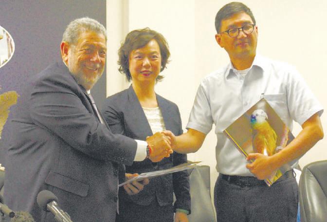 (L-R) Prime Minister Dr. Ralph Gonsalves, Taiwan’s Ambassador to SVG H.E. Fiona Huei-chun Fan and a Representative of OECC at the signing of an agreement on July 26, 2024.