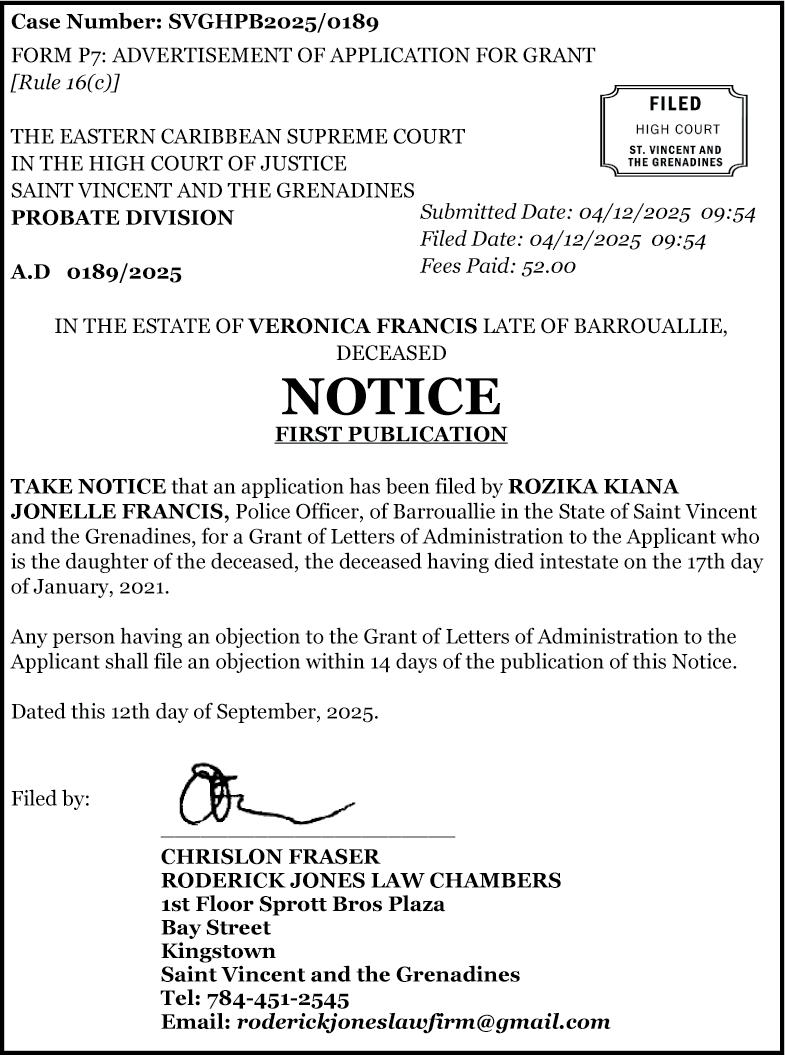 for assistance in locating Lyda “ Sherica” Adams. Adams, 36 years old resident of Keartons, Barrouallie, who is said to be six months pregnant, and according to a police report was last seen at 8:05 a.m. on Saturday, November 1, 2025, “wearing a Brown T-shirt with a teddy bear design on the front, long brown pants, and foot wear unknown. She is 5 feet 9 inches in height, fair in complexion, brown