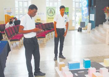 Shemar Browne of the St. Martins’ Secondary School (foreground) maneuvers the robot while team mate Christo Gibbons looks on.