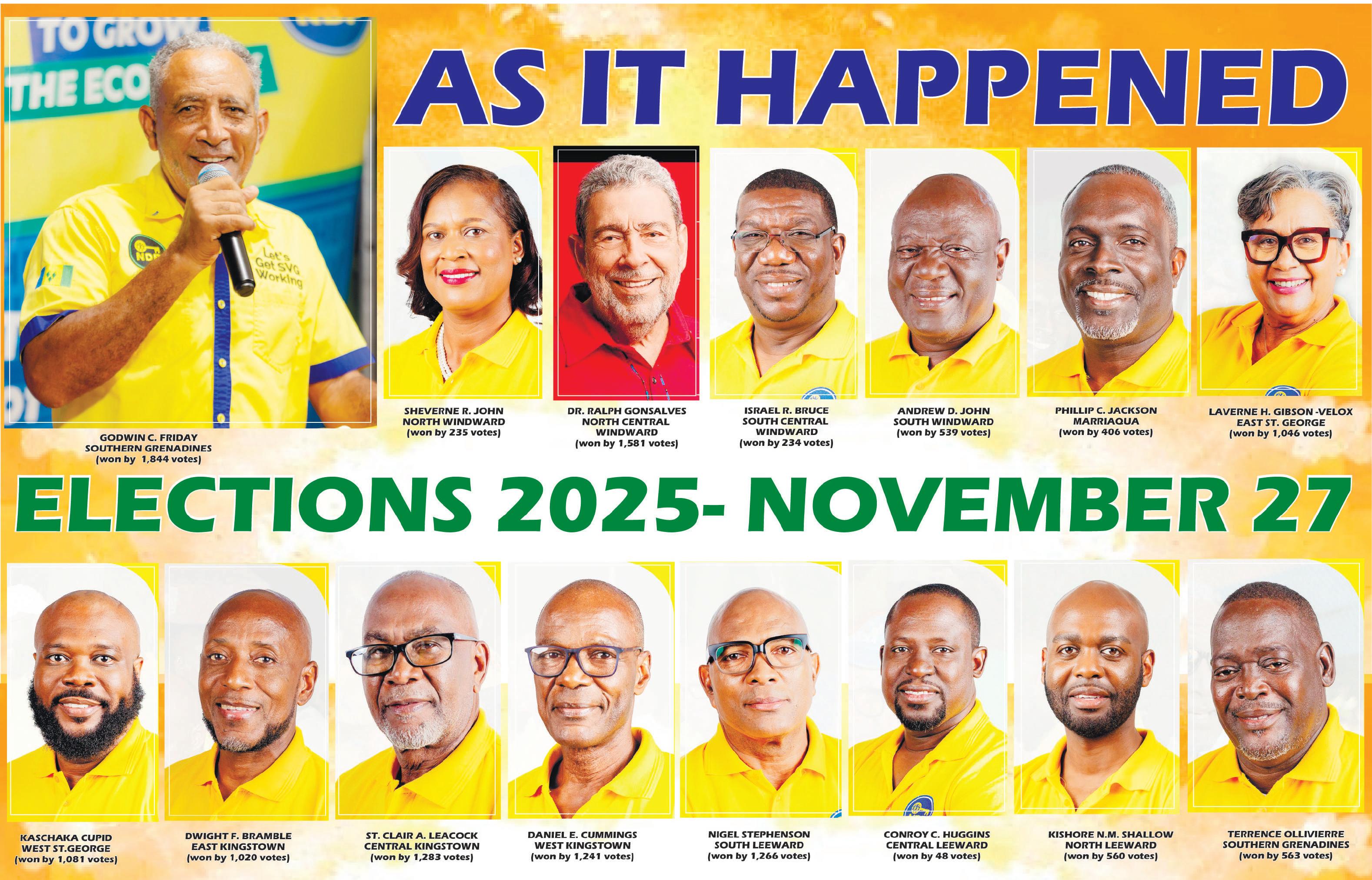 THE NEW DEMOCRATIC PARTY(NDP) carved out a new general election strategy, cranked up its campaign prowess, spent lavishly from what seemed to have been a wellstocked treasure chest, de-emphasized its previous elections focus on picking away at Prime Minister Dr. Ralph Gonsalves, concentrated on advancing its “plan” for the continued development of the country, and in the process took the reins of government from the Unity Labour Party (ULP) by the resounding margin of 14 to 1, in the Thursday 27th November, 2025 general election.