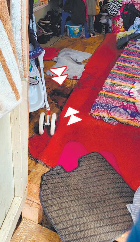 When this reporter visited the crime scene, he noticed a large blood stain in the yard between two structures that appear to be the combined dwelling places of the family.