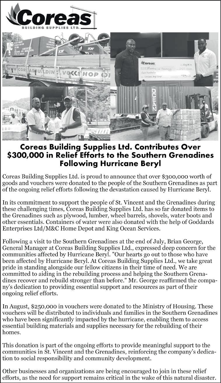 The REACT Group (a group of ex-British soldiers) and Gombolimbo are helping on Union Island and Canouan. Nine construction personnel from Romania are helping on Union Island and Canouan; also 10 Canadian construction workers are helping in Canouan; houses are