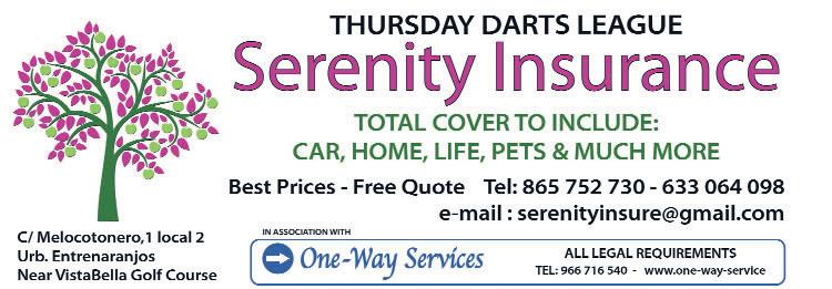 The committee are pleased to confirm SERENITY INSURANCE are continuing their support of Thursday darts, managing director Jane Leggat welcomes new enquiries for all types of family insurance.