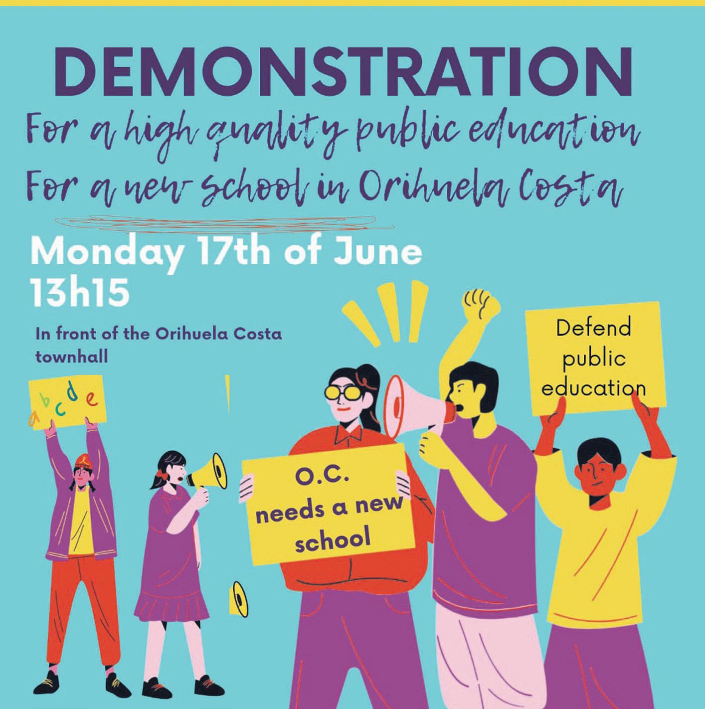 Orihuela Costa Parents are encouraging all residents to join them at the Orihuela Costa Town Hall in Playa Flamenca at 1.15 pm next Monday17 June in a demonstration about the lack of quality education on the coast.