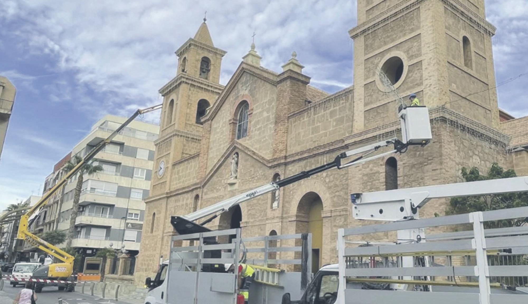The installation of Christmas lights in Torrevieja has begun, with cranes setting up light bulbs on the cornices of the main facade of La Purisima Temple.