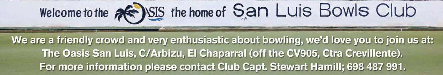 If you wish to find out more about bowling, or San Luis BC, please come along to Oasis to watch, maybe with a cool drink, or join in on an open “roll up” currently on Saturday mornings (9:00/9:30). Come and give yourself a chance to have fun and meet new friends.