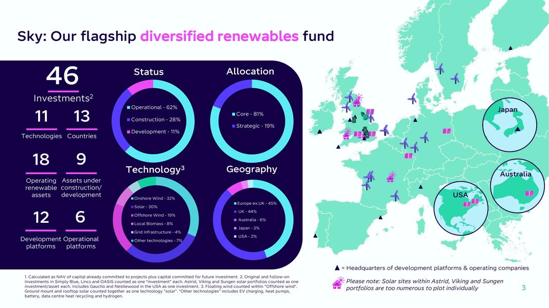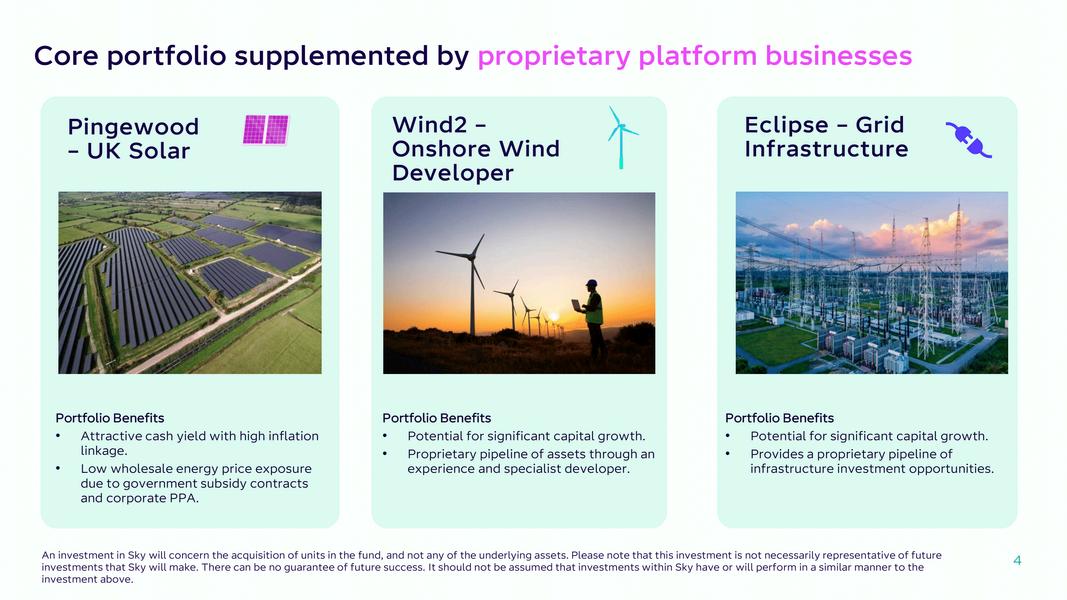 Sky’s portfolio supplements “core” renewable assets with “strategic” investments in either energy transition technologies or development opportunities For example, we invest in a number of development platform businesses which provide Sky a proprietary pipeline of future investible, offmarket capital deployment opportunities Once such example of this is our 100% acquisition of Eclipse in 2021
