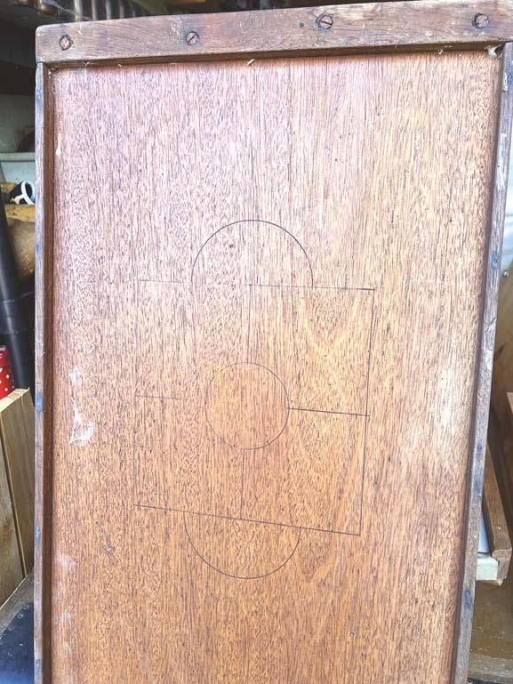 board', a 4 foot 6 inch giant version used for play exclusively in the Purbeck and Swanage area of Dorset. A single plank of mahogany, the scoring areas are marked but are unlike any conventional board, with a scorer needing to be present to total up as the ha'pennies float their way into the almost football-pitch like area. Scoring is as follows: The four squares 1-4. Centre circlefive, nearest semi-circle ten, the far, twenty. Familiarity of the game is thus essential. Although it is in need of some attention and restoration as you can see, it is certainly do-able, and despite being an amateur wood-butcher myself, I feel that advice from those who know the right way to proceed is pertinent thus eliminating the possibility of mistakes, which would be followed by regret and guilt for be-spoiling such a wonderful object. Many thanks indeed to Dale for his most generous gift. A Swanage board is revered by collectors and hardly had I posted a picture on the aforementioned Facebook site when I received a request asking if I would sell. The answer was a firm 'NOPE!' and I think that may well be added to my will, to be passed onto a certain other enthusiast I know well ... Dale also very generously gave me three very old shove ha'penny boards in need of some restoration, two of which should be quite simple with which to proceed. I'm sure I can fit those in after restoring a 'Twister', building a table skittles and several more bats for Bat and Trap. Sitting around is something that will not be occurring!