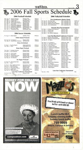 2006 Fall Sports Schedule 2006 Football Schedule Thu. Aug. 31 — Missouri Western . Thu. Sept. 7 — Abilene Christian Sat. Sept. 16 — Angelo State Sat. Sept. 23 — Eastern New Mexico Sat. Sept. 30 — Texas A&M-Commerce Sat. Oct. 7 — East Central Sat. Oct. 14 — Northwestern Oklahoma Sat. Oct. 21 — Southeastern Oklahoma Sat. Oct. 28 — Southwestern Oklahoma Sat. Nov. 4 — West Texas A&M Sat. Nov. 11 — Northeastern State
