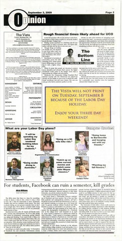 EDITORIALS Opinion columns, editorial cartoons, reviews and commentaries represent the views of the writer or artist and not necessarily the views of The Vista Editorial Board, the Department of Mass Communication, UCO or the Board of Regents of Oklahoma Colleges. The Vista is not an official medium of expression for the Regents or UCO.