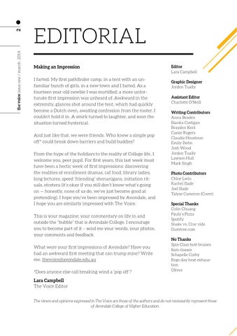 EDITORIAL Making an Impression I farted. My first pathfinder camp, in a tent with an unfamiliar bunch of girls, in a new town and I farted. As a fourteen year-old newbie I was mortified; a more unfortunate first impression was unheard of. Awkward in the extremity, glances shot around the tent, which had quickly become a Dutch oven, awaiting confession from the tooter. I couldn’t hold it in. A smirk turned to laughter, and soon the situation turned hysterical. And just like that, we were friends. Who knew a simple pop off* could break down barriers and build buddies? From the hype of the holidays to the reality of College life, I welcome you, peer pupil. For first years, this last week must have been a hectic week of first impressions: discovering the realities of enrollment dramas, caf food, library ladies, long lectures, speed ‘friending’ shenanigans, initiation rituals, etcetera (it’s okay if you still don’t know what’s going on — honestly, none of us do, we’ve just become good at pretending). I hope you’ve been impressed by Avondale, and I hope you are similarly impressed with The Voice. This is your magazine; your commentary on life in and outside the “bubble” that is Avondale College. I encourage you to become part of it – send me your words, your photos, your comments and feedback. What were your first impressions of Avondale? Have you had an awkward first meeting that can trump mine? Write me. thevoice@avondale.edu.au *Does anyone else call breaking wind a ‘pop off’?