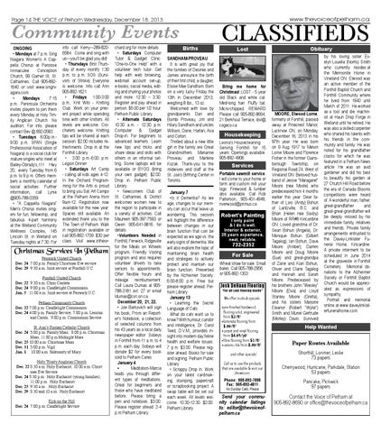 chard.org for more details. • Saturdays Computer Tutor & Gadget Clinic. “One-to-One Help” with a volunteer tech tutor. Get help with web browsing, webmail account set-up, e-books, social media, editing and sharing your photos and more. 12:30 – 3:30. Register and pay ahead in person. $5.00 per 1/2 hour. Pelham Public Library. • Alternate Saturdays 10:30 a.m. - 12:30 p.m. Computer & Gadget Drop-in: For beginners to advanced learners. Learn new tips and tricks and share ideas and skills with others in an informal setting. Some laptops will be available or BYOG (bring your own gadget). $2.00. Drop in. Pelham Public Library. • Newcomers Club of St. Catharines & District welcomes women new to the region to participate in a variety of activities. Call Maureen 905-397-7593 or Gwen 905-641-9816 for details. •Volunteers Needed in Fonthill, Fenwick, Ridgeville for the Meals on Wheels program. Friendly Visiting program and also requires volunteer drivers to take seniors to appointments. Offer flexible hours and mileage reimbursement. Call Laura Dumas at 905788-3181 ext. 27 or email ldumas@csn.on.ca. December 20, 21, 22. • Joe Barkovich will sign his book, From an Reporter’s Notebook, a collection of selected columns from his 43 years as a local daily newspaper editor. Sobeys in Fonthill from 11 a.m. to 4 p.m. each day. Sobeys will donate $2 for every book sold to Pelham Cares. January 4 • Meditation-Marcia leads you through different types of meditations. Great for beginners and those who have meditated before. Please bring a pen and notebook. $3.00. Please register ahead. 2-4 p.m.Pelham Library