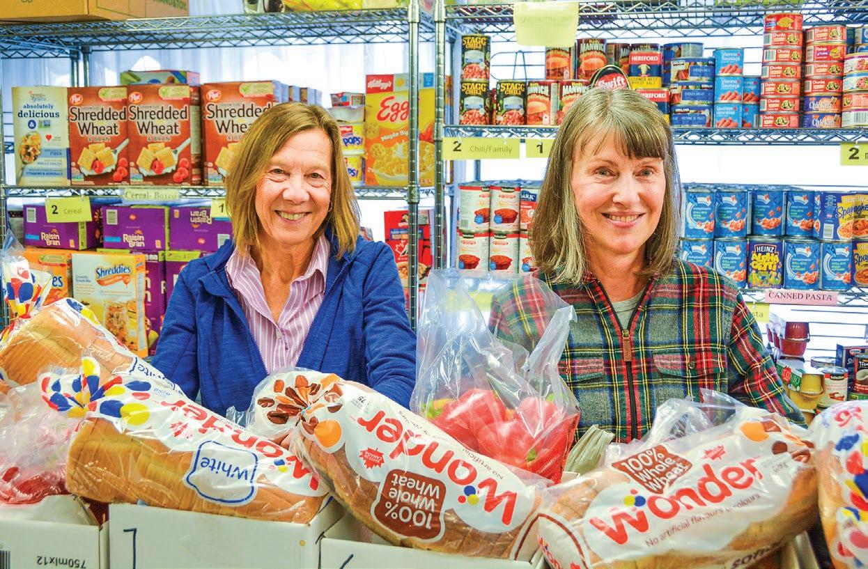 Pelham Cares volunteers Debbie Harrison and Wendy Glaab stock shelves at the food bank