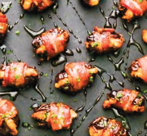 There may be plenty of prepared foods in the grocer’s freezer that can be served for gatherings, but the taste of easy, homemade offerings can mingle with the time-savers when guests arrive. “Bacon-Wrapped Goat Cheese Stuffed Dates” are an easily prepared appetizer that pairs sweet with savory. Even better, these morsels are delicious served warm out of the oven or can be eaten at room temperature when late-arriving guests stroll in.
