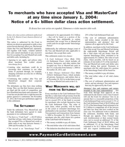 estimated to be approximately $1.2 billion – that will be based on a portion of the interchange fees attributable to certain merchants that accept Visa or MasterCard credit cards for an eight-month “Interchange Period.” Additionally, the settlement changes some of the Visa and MasterCard rules applicable to merchants who accept their cards. This settlement creates two classes: • A Cash Settlement Class (Rule 23(b) (3) Settlement Class), which includes all persons, businesses, and other entities that accepted any Visa or MasterCard cards in the U.S. at any time from January 1, 2004 to November 28, 2012, and • A Rule Changes Settlement Class (Rule 23(b)(2) Settlement Class), which includes all persons, businesses, and entities that as of November 28, 2012 or in the future accept any Visa or MasterCard cards in the U.S.