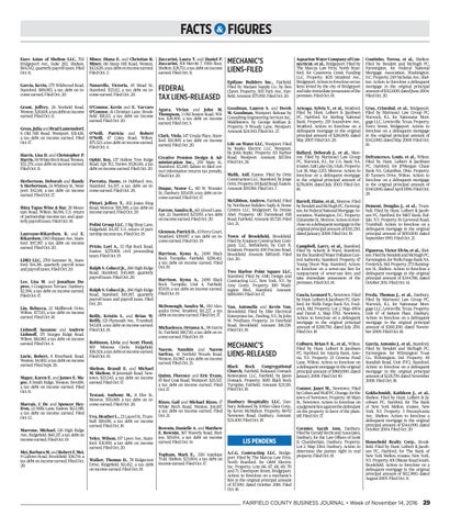 FIGURES MECHANIC’S LIENS-FILED Epifano Builders Inc., Fairfield. Filed by Marjam Supply Co., by Ben Clavet. Property: 5151 Park Ave., Fairfield. Amount: $75,950. Filed Oct. 20. Goodman, Lauren S. and Derek M. Goodman, Westport. Release by Consulting Engineering Services Inc., Middletown, by George Keithan Jr. Property: 9 Woody Lane, Westport. Amount: $24,943. Filed Oct. 27. Life on Water LLC, Westport. Filed by Repko Electric LLC, Westport, by John Repki. Property: 115 Harbor Road, Westport. Amount: $17,584. Filed Oct. 26. Malik, Asif, Easton. Filed by Ortiz Construction LLC, Stamford, by Jorge Ortiz. Property: 119 Judd Road, Easton. Amount: $50,961. Filed Oct. 7. McGibbon, Andrew, Fairfield. Filed by Northeast Builders Suply & Home Centers LLC, Bridgeport, by Denise Abel. Property: 110 Farmstead Hill Road, Fairfield. Amount: $5,720. Filed Oct. 21. Town of Brookfield, Brookfield. Filed by Knutson Construction Company LLC, Bethlehem, by Curt R. Knutson. Property: 100 Pocono Road, Brookfield. Amount: $185,645. Filed Oct. 20. Two Harbor Point Square LLC, Stamford. Filed by AMG Design and Contracting LLC, New York, N.Y., by Amy Goetz. Property: 100 Washington Blvd., Stamford. Amount: $188,000. Filed Oct. 17. Van, Antonella and Kevin Van, Brookfield. Filed by Elite Electrical Enterprises Inc., Pawling, N.Y., by John W. Predham. Property: 34 Deerfield Road, Brookfield. Amount: $18,338. Filed Oct. 18.