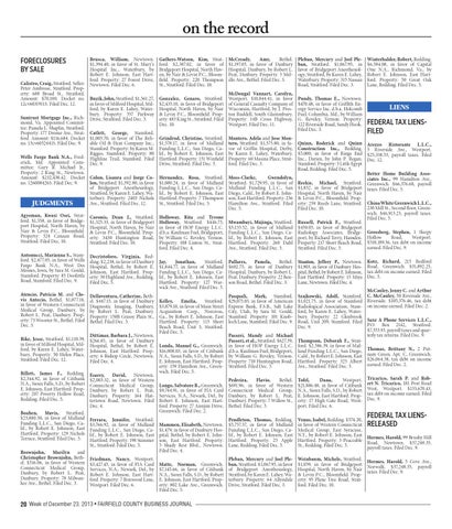 Pasquali, Mark, Stamford. Kelley, Emelia, Stratford. $29,075.03, in favor of American $3,879.10, in favor of Main Street Express Bank, F.S.B., Salt Lake Acquisition Corp., Norcross, City, Utah, by Sara M. Gould, Ga., by Robert E. Johnson, East Stamford. Property: 101 KnobHartford. Property: 115 Short loch Lane, Stamford. Filed Dec. 9. Beach Road, Unit 3, Stratford. Filed Dec. 5. Passeri, Mandy and Michael Passeri, et al., Stratford. $627.39, Londa, Manuel G., Greenwich. in favor of HOP Energy L.L.C. $16,008.03, in favor of Citibank d.b.a. Kaufman Fuel, Bridgeport, N.A., Sioux Falls, S.D., by Robert by William G. Reveley, Vernon. E. Johnson, East Hartford. Prop- Property: 710 Huntington Road, erty: 159 Hamilton Ave., Green- Stratford. Filed Dec. 3. wich. Filed Dec. 5. Pedreira, Flavio, Bethel. $691.96, in favor of Western Connecticut Medical Group, Danbury, by Robert L. Peat, Danbury. Property: 7 Willow St., Bethel. Filed Dec. 3.