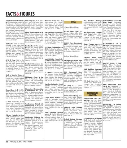 MAMARONECK, 770 N. Barry Ave. Two-family dwelling; .08 acre. Plaintiff: U.S. Bank N.A. Plaintiff ’s attorney: McCabe, Weisberg & Conway P.C., (914) 636-8900; 145 Huguenot St., Suite 401, New Rochelle. Defendant: Jaime Barrera. Referee: John Sarcone. Teutonia Buena Vista Sale: Feb. 27, 10 a.m. ApproxiL.L.C., Congers. Seller: Paul mate lien: $403,071.29. Pavelchak, Yonkers. Property: 61 Buena Vista Ave., Yonkers. Amount: $735,000. MOUNT KISCO, 21 New Castle Drive. Two-family Filed Feb. 13. dwelling; 65 x 167. Plaintiff: Wells Fargo Bank N.A. PlainTodd Building Associates tiff ’s attorney: McCabe, WeisInc., Yorktown. Seller: El- berg & Conway P.C., (914) iquine L.L.C., Cortlandt Man- 636-8900; 145 Huguenot St., or. Property: 2158 Crompond Suite 401, New Rochelle. DeRoad, Cortlandt. Amount: fendant: Bonnie Caracciolo. $797,262. Filed Feb. 15. Referee: Loren Glassman. Sale: Feb. 26, 10 a.m. Approximate U.S. Bank N.A. Seller: Dar- lien: $553,487.79. ren De Urso, White Plains. Property: 100 Grandview NEW ROCHELLE, 1279 Ave., Rye. Amount: $391,333. North Ave. Restaurant; .13 Filed Feb. 13. acre. Plaintiff: 1279 North Avenue NR L.L.C. Plaintiff ’s attorney: Corash & Hollender P.C., (718) 442-4424; 1220 Foreclosure South Ave., Staten Island. DeAuctions fendant: 1279 NA L.L.C. Referee: Julie Cvek Curley. Sale: BRONXVILLE, 1376 Mid- March 5, 11 a.m. Approximate land Ave., Apt. 512. Apart- lien: $868,718.88. ment. Plaintiff: Wells Fargo Bank N.A. Plaintiff ’s attorney: Peter T. Roach & Associates, PEEKSKILL, F10 Rolling (516) 938- 3100; 125 Michael Way, Unit F10. CondominiDrive, Suite 105, Syosset. De- um. Plaintiff: U.S. Bank N.A. fendant: Kim Parish. Referee: Plaintiff ’s attorney: Knuckles, Lynn Janette Maier. Sale: Komosinski & Elliot, (914) March 11, 9 a.m. Approximate 345- 3020; 565 Taxter Road, Suite 509, Elmsford. Defenlien: $244,814.55. dant: Carol Johnson. Referee: Michelle Bermel. Sale: Feb. 27, EASTCHESTER, 26 Huntley 9:30 a.m. Approximate lien: Road. Single-family residence; $273,179.34. .12 acre. Plaintiff: TD Bank. Plaintiff ’s attorney: Phillips Lytle Hitchcock Blaine Haber, (585) 238-2000; 1400 First Federal Plaza, Rochester. Defendant: Jude Valerjoti. Referee: Kenneth Bunting. Sale: Feb. 27, 9 a.m. Approximate lien: $105,531.69. Shaare Parnasa Inc., Great Neck. Seller: Wellesley Ventured Ltd., aka Wellesley Ventures Ltd., New York. Property: 31 Wellesley Ave., Yonkers. Amount: $100,881. Filed Feb. 14.
