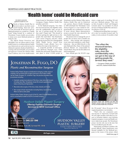 the 250 people.” About 40 percent of the targeted population was homeless. “That’s why our community partners became so important,” Leonard said. WCAP’s eight-member staff relied on contacts at homeless shelters, soup kitchens, hospital emergency rooms and health centers to help locate people. The Westchester project was the only one in the state that met its enrollment goal, she said. Maintaining enrollment numbers also proved difficult. Many beneficiaries were deemed ineligible for the Medicaid program in the course of the project, which Health home, page 32