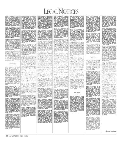 Notice of Formation of Redu4u, LLC. Arts. of Org. filed with SSNY on 4/15/2013. Office location: WestchesterCounty. SSNY designated as agent of LLC upon whom process may be served. SSNY shall mail process to C/O Redu4u, LLC, Direct Incorporation 123 N Ashley Ste 123, Ann Arbor, MI 48104. Purpose: Any Lawful Purpose.Latest date upon which LLC is to dissolve: No specific date. #58739 NOTICE OF FORMATION OF LIMITED LIABILITY COMPANY (LLC): Name: Michelleís Ultimate Gift, LLC. Arts. of Org. filed with N.Y. Secy. of State 2/28/13. Office location: Westchester County. Secy. of State designated agent of LLC upon whom process may be served. Secy. of State shall mail a copy of process to the LLC c/o Maria M. Stark, 638 Anderson Hill Road, Purchase, N.Y 10577. #58741 CV Capital, LLC, Art. of Org. filed with NY Secy. of State on 05/08/2013. Office located in Westchester Co. Secy. of State designated as agent upon which process may be served. Secy. of State shall mail a copy of any process against it served upon him/her to: 7-11 South Broadway, Suite 308, White Plains, NY 10601 (the LLCís primary business location). LLC may engage in any lawful act or activity for which a limited liability company may be formed. #58742 Notice of Formation of SB RIVERDALE LLC. Arts. of Org. was filed with SSNY on 5/13/13. Office location: Westchester County. SSNY designated as agent of LLC whom process against may be served. SSNY shall mail process to: Ronald Portnoy, c/o Canyon Properties, 575 Jericho Tpke., Jericho, NY 11753. Purpose: all lawful activities. #58743 Notice of Formation of 431 East 115 Street LLC. Arts. of Org. filed with Secy. of State of NY (SSNY) on 4/5/13. Office location: Westchester County. SSNY designated as agent of LLC upon whom process against it may be served. SSNY shall mail process to: c/o Sanford Glatzer, 670 Post Road Route 22, Suite #22, Scarsdale, NY 10583. Purpose: any lawful activity. #58744 MOBIEHL HOLDING COMPANY, LLC, Arts. of Org. filed with the SSNY on 04/18/2013. Office loc: Westchester County. SSNY has been designated as agent upon whom process against the LLC may be served. SSNY shall mail process to: 1022 Cove Road, Mamaroneck, NY 10543. Purpose: Any Lawful Purpose. #58746