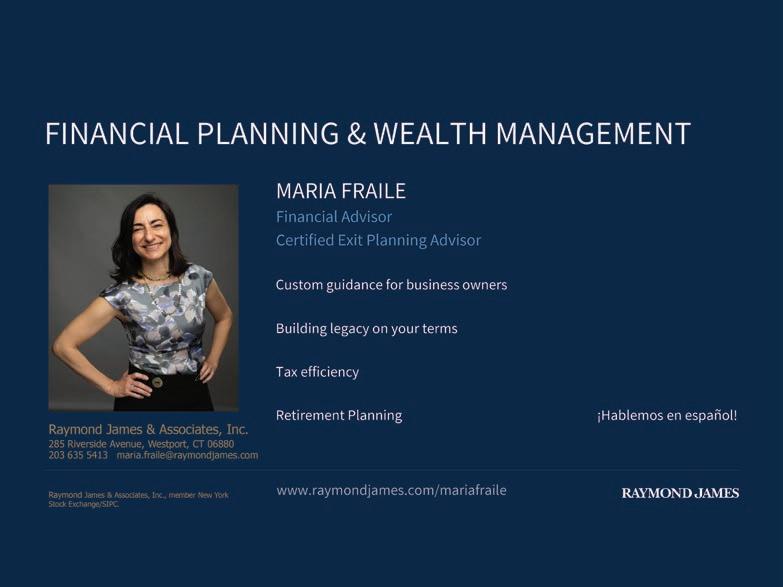 María Fraile provides sophisticated wealth-planning strategies for business owners and their families, with a focus on helping entrepreneurs grow their companies, build value inside and outside their businesses, and create lasting legacies. An MBA graduate of the MIT Sloan School of Management, she brings advanced business and financial expertise to her work with successful and fast-growing companies. She also understands the complexities faced by clients in the highest tax brackets, having served high-net-worth families for more than 15 years. Fraile began her investment career in 2002 in Spain, working with private clients at Morgan Stanley and UBS. She moved to the United States in 2008 to complete her MBA at MIT, concentrating in entrepreneurship and innovation. Her experience includes roles outside the financial sector, including at the headquarters of international consumer brands, as well as launching her own food-industry business. In 2017, she returned to the financial field, joining Raymond James and establishing her practice as a financial advisor. Committed to making a positive impact, Fraile is passionate about teaching children and teenagers the principles of financial freedom and compound interest. She and her husband donate their time—and 5% of their income—to organizations that support children in need. Outside the o ce, she values time with her husband and their three young daughters, visiting family and friends, enjoying the outdoors, eating healthy, staying active, and dancing salsa.