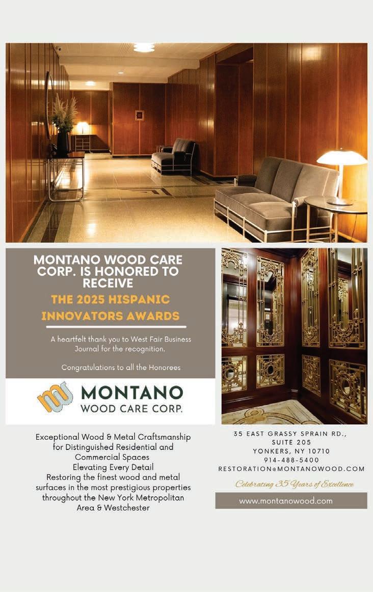 Wilfredo and Sonia Montano exemplify the power of determination, craftsmanship and family. From humble beginnings in Peru to building one of New York’s most respected wood and metal refinishing companies, they have led Montano Wood Care Corp. through 35 years of excellence—restoring surfaces in some of the region’s most notable residential, commercial and landmark properties. After immigrating to the United States, Wilfredo discovered his passion for fine restoration and founded Montano Wood Care in 1990. His dedication to precision and integrity quickly earned the company a reputation for exceptional craftsmanship. Sonia, whose early career was in journalism and publishing, brought her business acumen and strategic leadership to the company, establishing the operational foundation that fueled its growth. A Magna Cum Laude graduate in business administration from The College of Westchester, she also serves as president of the Westchester Hispanic Chamber of Commerce, where she advocates for education, equity and Hispanic entrepreneurship. Together, they have built both a thriving business and a family legacy. They are parents to two sons, Manuel and Willy, and grandparents to two granddaughters. As Willy steps into the next generation of