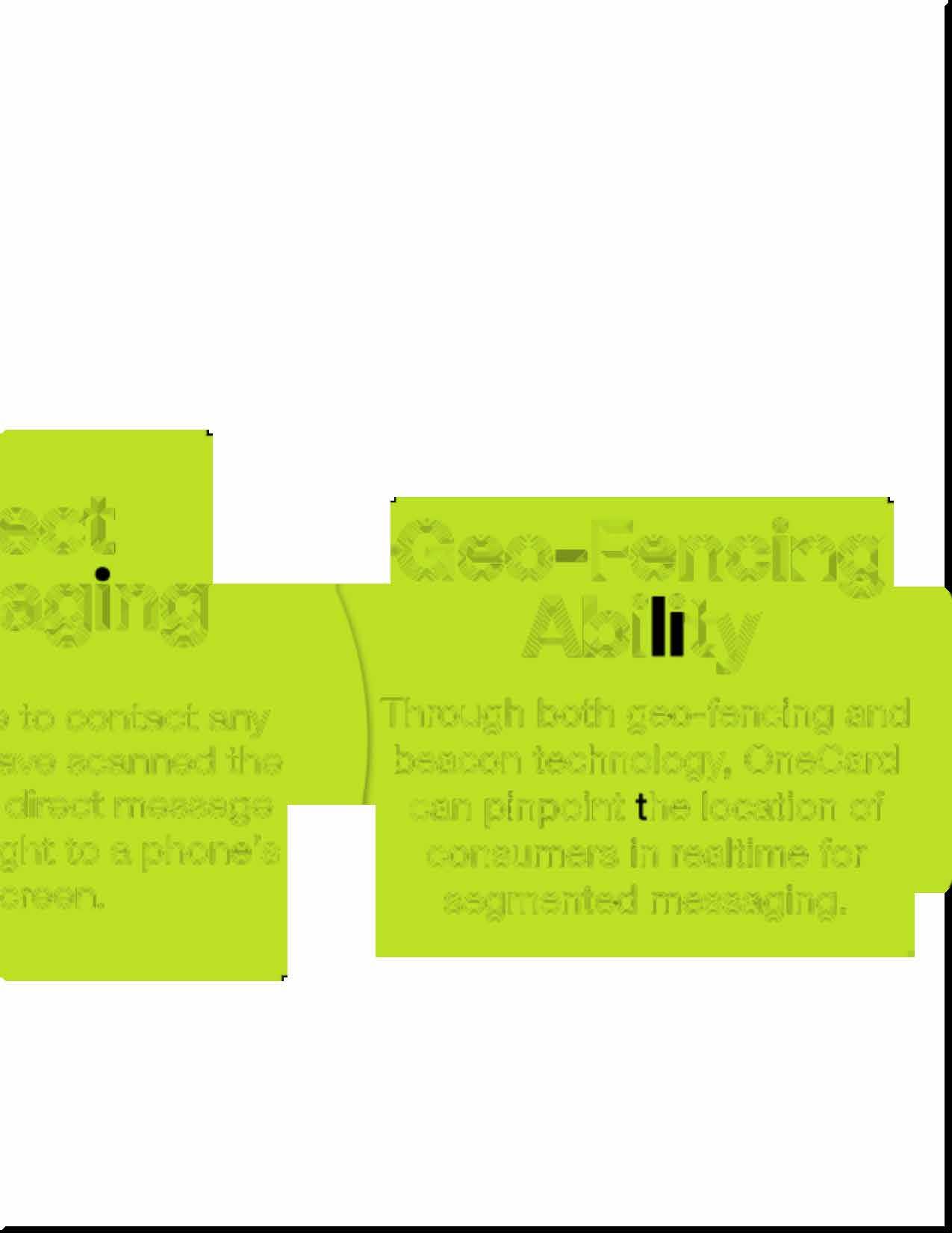 Through bothgeo-fencing and beacontechnology, OneCard canpinpoint helocationof consumersinrealtimefor segmented messaging.