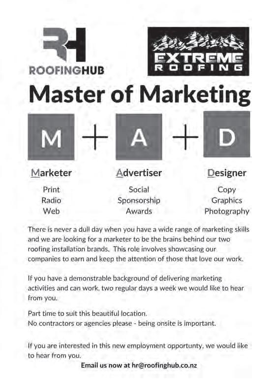 Volume XLIV | No. 47 | 30 th November 2022 11 Brownston St, Wanaka | (03) 443 7805 | hello@mymessenger.co.nz | www.mymessenger.co.nz Offer of finance is subject to terms, conditions, lending criteria, responsible lending inquiries and checks. See mtf.co.nz/terms for details. Helping New Zealanders do more Whether it’s a new car for the family, a boat for the lake or equipment for the business, MTF Finance Central Otago can help. mtf.co.nz/centralotago Julia Bentley 027 722 0027 julia.bentley@mtf.co.nz Fi Sim 027 433 5511 fi.sim@mtf.co.nz Call Julia or Fi today FABRICATORS OF CUSTOM FLASHINGS roofinghub.co.nz 3 Connell Terrace | p. 443 2794 | orders@roofinghub.co.nz You sketch it, we'll make it. Lisinda Rickman Licensee 021 482 768 lisinda@ljhwanaka.co.nz wanaka.ljhooker.co.nz Stephanie Georgalli Licensee 021 744 452 stephanie@ljhwanaka.co.nz wanaka.ljhooker.co.nz Lakes Realty Ltd MREINZ Licensed Real Estate Agent (REAA 2008) Proven success with a quality team Welcome Graeme Barbara Call 021 532 427. Ask what your property is worth in today’s market. Vaunt NZ Ltd T/A proppy.co.nz, Licensed Real Estate Agent (2008)